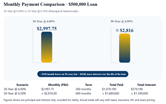 A 50-year mortgage buys time, not real savings. If you see headlines or ads promising big payment cuts, check the interest rate and run the full cost comparison. Most buyers and homeowners will be better served by optimizing a 30-year or using tools like buydowns and lender shopping.